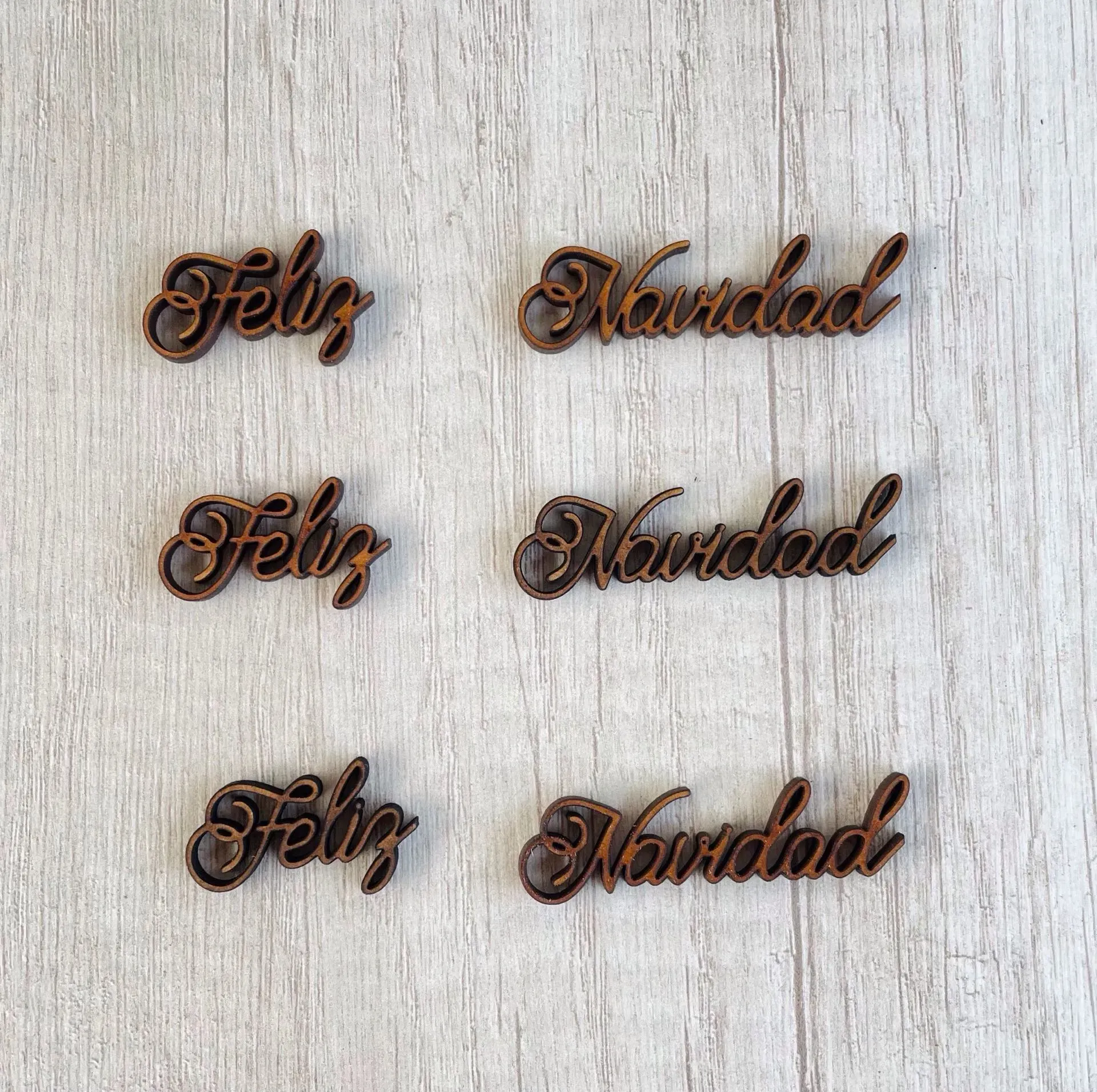 6 piezas en MDF de 3 milímetros corte laser medidas por pieza feliz 2 x 3.4 cms navidad 1.7 x 5.8
