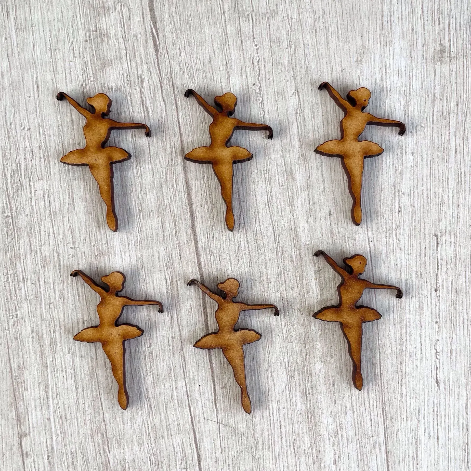 6 piezas en MDF de 3 milímetros corte laser medidas por pieza 2.8 x 4.5 cms